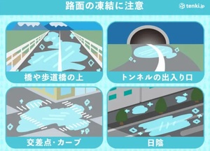 …凍結しやすい場所は、日陰はもちろんですが、その他、橋や歩道橋の上、トンネルの出入り口や交差点・カーブなどです。橋の上や歩道橋の上などは風通しが良いため、気温が低くなり、他の道路よりも凍結しやすくなっている可能性が高くなります。また、日中いったん雪が溶けてしまったとしても、夜間に再び凍結してツルツルになっているということもありますので注意が必要です!