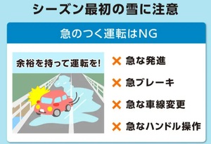 冬期の車の運転の際のポイントは、「急」のつく操作はNG、ということです。「急」のつく操作というと、急ブレーキ、急発進、急なハンドル操作、急な車線変更などです。