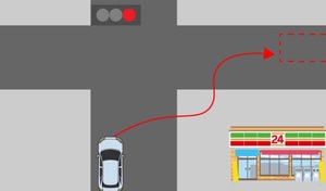 ・右折待ちを避けるパターン(混雑した交差点で右折しようとした際、対向車線の車が途切れず右折待ちが長引く状況)